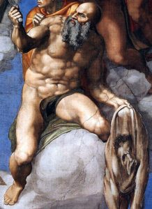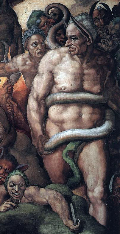 elea în mâini. Potrivit unei interpretări chestionabile, fizionomia sfântului împrumută trăsăturile celui mai necruţător critic al artistului (Pietro Aretino); chipul „carcasei” de piele, fără nici un dubiu, este însă un autoportret. În aceeaşi frescă, în colţul din dreapta jos, cu înfăţişarea hâdă a lui Minos – judecătorul sufletelor în infern – este pictat un alt personaj al epocii: Biagio da Cesena, maestrul de ceremonii al Papei, imortalizat astfel întrucât îndrăznise să condamne nuditatea personajelor pictate de Michelangelo. Care să fie tâlcul acestor transferuri de identitate?