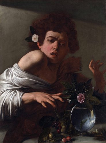 imagine jos: Caravaggio, Băiat muşcat de şopârlă, 1594-96, ulei pe pânză