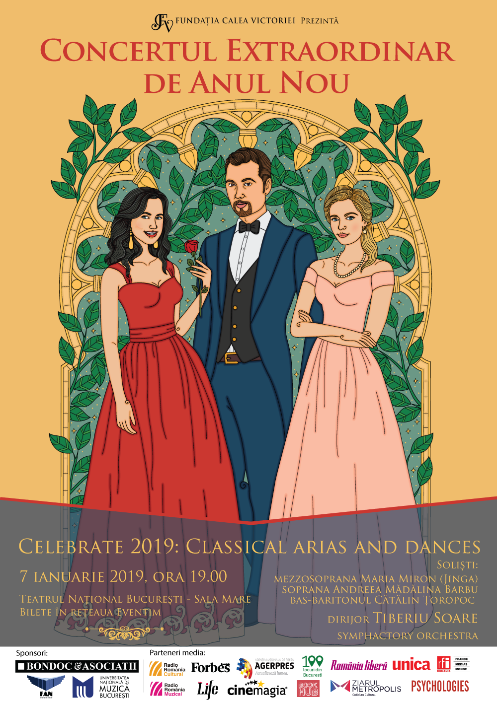 Fundaţia Calea Victoriei vă invită în 7 ianuarie, ora 19.00, la Teatrul Naţional Bucureşti, Sala Mare, să începeţi anul 2019 cu magia muzicală creată de dirijorul Tiberiu Soare şi Symphactory Orchestra, alături de trei solişti de operă remarcabili: mezzosoprana Maria Miron (Jinga), bas-baritonul Cătălin Ţoropoc şi soprana de coloratură Mădălina Andreea Barbu. Dacă nu poţi ajunge la concert, îl poţi asculta în direct pe Radio România Muzical sau îl poţi urmări pe TVR 3.
