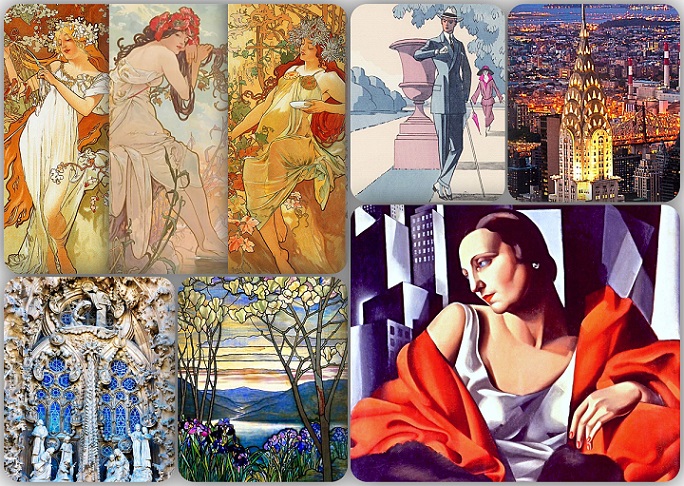 Dacă ni s-ar cere să definim societatea de la începutul secolului XX, am găsi cu uşurinţă printre ideile epocii, două concepte care să îi înfăţişeze aspiraţiile, cotidianul, angoasele şi bucuriile. Curentele Art Nouveau şi Art Deco, deoarece despre ele este vorba, condensează toate mutaţiile cunoscute de civilizaţia europeană şi americană, într-o epocă în care nu doar arta, ci şi societatea trec printr-o serie de revoluţii şi drame.