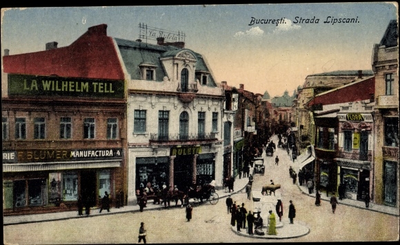 Imagine preluată de aici: http://www.akpool.co.uk/postcards/24241100-postcard-bukarest-rumaenien-strada-lipscani-manufactura-4-la-wilhelm-tell