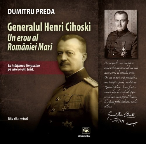 Pe măsură ce ne îndepărtăm de evenimente le pomenim tot mai rar, până ce, uneori, le uităm. Cu siguranţă că nu toate faptele sunt reţinute de istorie dar cu siguranţă că „faptele mari”, intens trăite de autorii lor, cu gândul la Patria pe care o slujesc, în cazul militarilor, indiferent de grad, fac parte din acestă panoplie nobilă a neamului. Pornind de la o asemenea logică vom aşterne câteva consideraţii şi impresii după lectura ediţiei a II-a, revăzute, a lucrării semnate de Dumitru Preda, închinată generalului Henri Cihoski, un ostaş care a trăit luptând pentru ţară! Editura Militară s-a alăturat demersului ştiinţific al autorului de reconstituire a vieţii unui Erou care şi-a rostuit viaţa în campaniile pentru înfăptuirea României Mari, acţiune încadrată strict documentat în contextul evenimentelor internaţionale şi a bătăliilor de pe fronturile unde întâia „virtute a militarului” era iubirea Patriei.