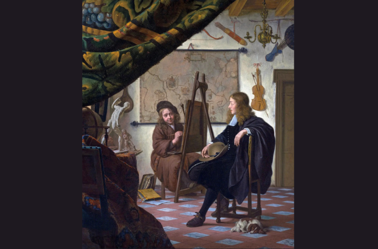 La mijlocul veacului al XVII-lea, societatea olandeză întreţinea obiceiul vizitării atelierelor de artişti, de regulă în grup, ca o formă de exersare a artei conversaţiei, de cultivare estetică şi, în general, ca un ritual de civilitate. La rândul lor, artiştii care participau la acest ceremonial (cu mize lucrative) aveau grijă să expună un tablou suficient de spectaculos încât să dea măsura artei lor. Johannes Vermeer (1632–75), cel mai faimos pictor din Delft, a primit cel puţin trei asemenea vizite. În urma celei dintâi, în ziua de 11 septembrie 1663, diplomatul francez Balthasar de Monconys nota în jurnal că, din nefericire, artistul nu-i putuse arăta nimic. În schimb, cu ocazia celei de-a treia, făcută la 21 mai 1669 de regentul Pieter Teding van Berckhout în compania eruditului connaisseur Constantijn Huyghens1, „celebrul pictor numit Vermeer” le va fi prezentat cu certitudine capodopera pictată între timp, intitulată chiar „Arta picturii” (De Schilderkonst)