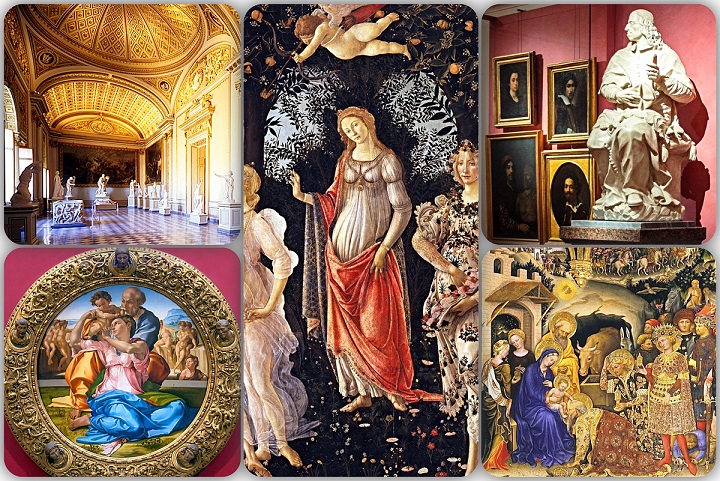Vom admira şi discuta, apoi, creaţiile lui Botticelli, cele pe care le identificăm imediat cu universul florentin şi cu mediile neoplatoniciene. Primăvara, Naşterea Venerei sau Pallas şi Centaurul ne vor permite să întrezărim aspecte intelectuale şi politice din epocă. Vom continua, apoi, cu Leonardo da Vinci (Bunavestire şi Adoraţia Magilor) şi cu Tondo Doni a lui Michelangelo. Nu vom uita nici de minunata Venus a lui Tiţian şi nici de Caravaggio. La sfârşitul vizitei noastre ne vom delecta cu câteva sculpturi şi tablouri din galeria de autoportrete.